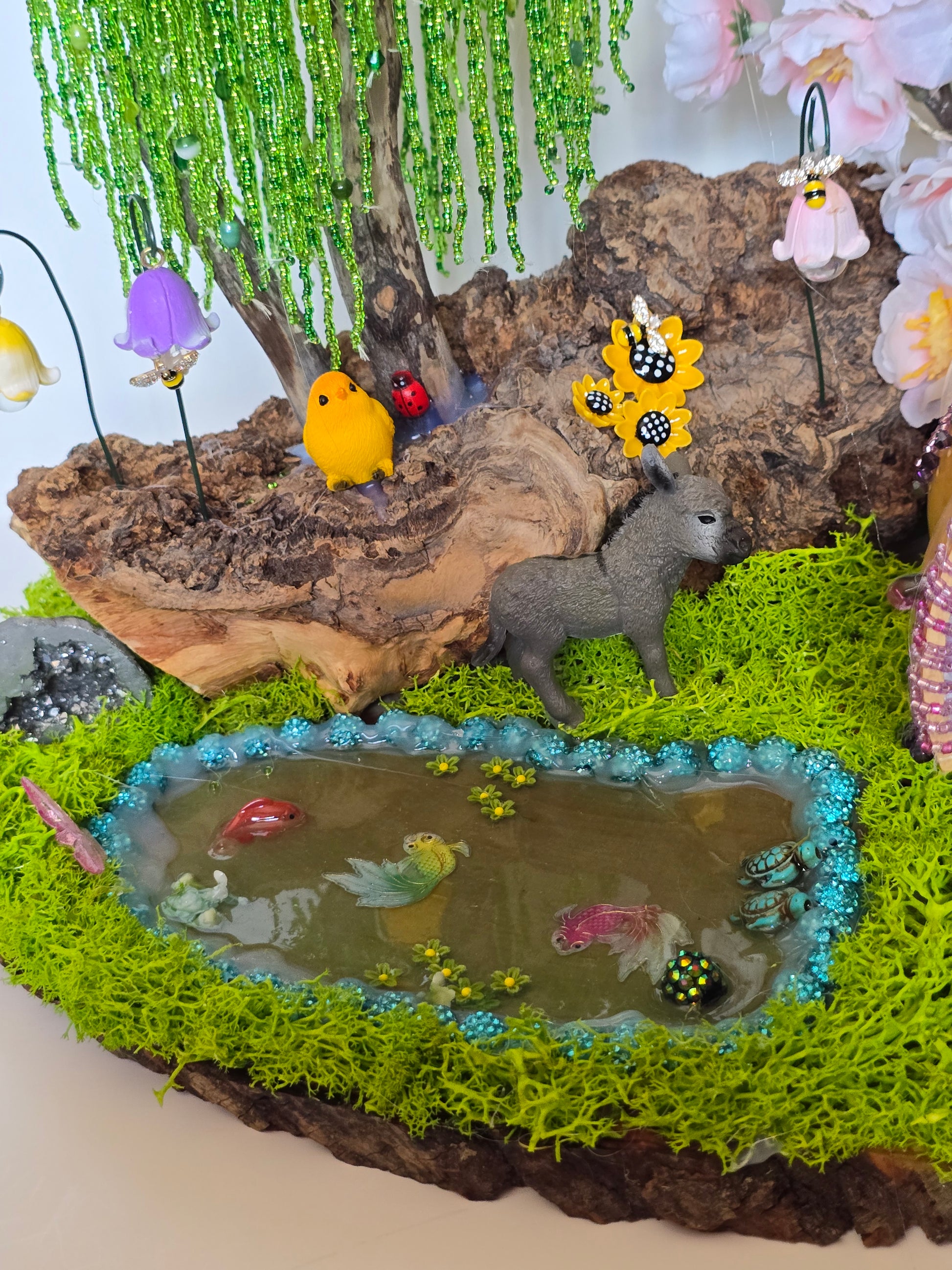 This beaded tree figurine is handmade and decorated with incredible creativity. The green color adds a unique touch to the design, making it a standout piece for holiday or seasonal decor. Perfect for collectors or anyone looking to add a special touch to their home decor. It's 14 by 16 inches. It also lights up.