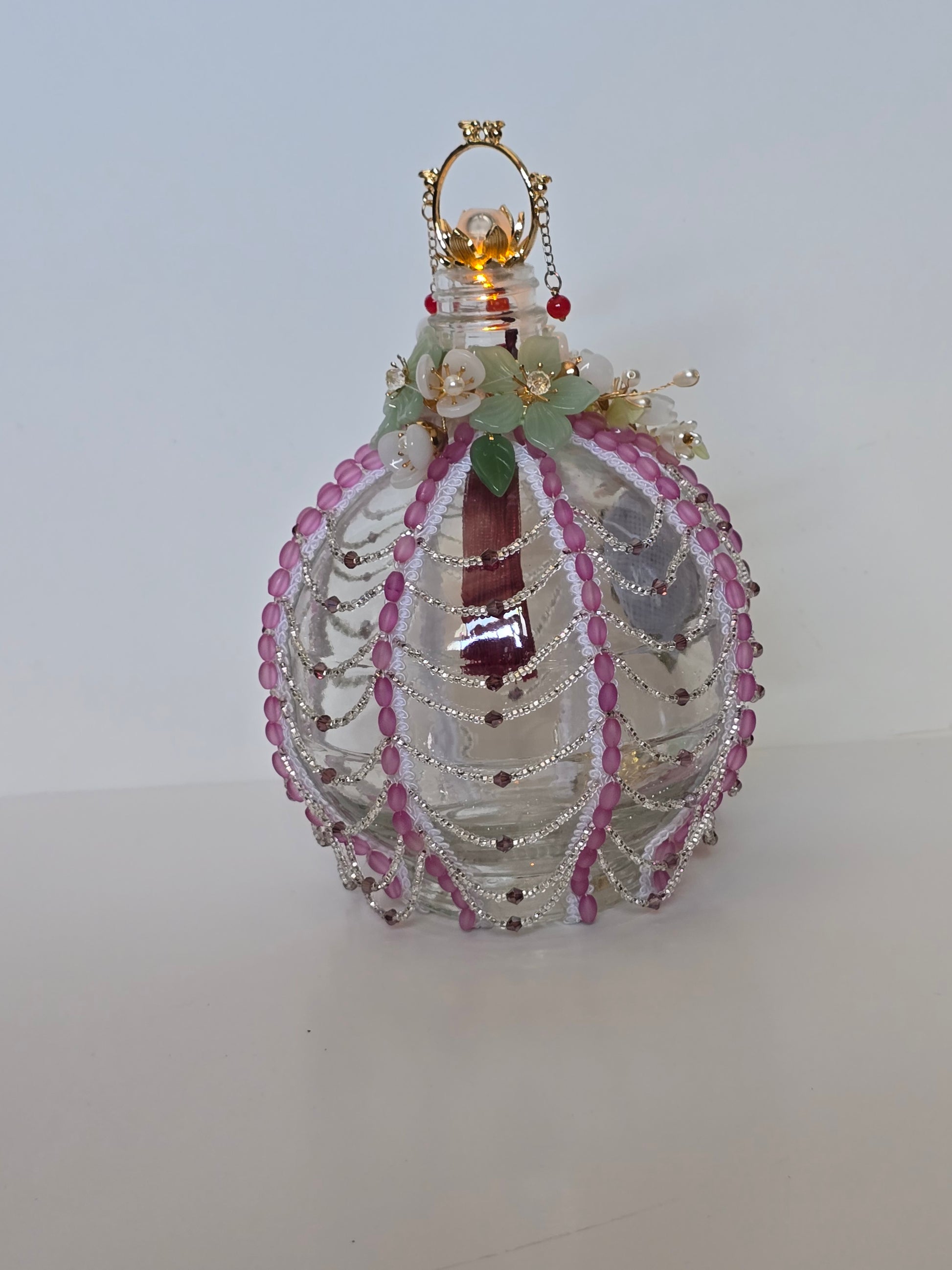This handmade glass jar is a unique decorative piece that features beads and a light on top. The jar is made of glass and measures 8 inches in height, with a width and length of 4 1/2 inches. It has a decorative theme and is an original production style of art glass. Made in the United States, this jar is a one-of-a-kind item that adds a touch of handmade charm to any space.