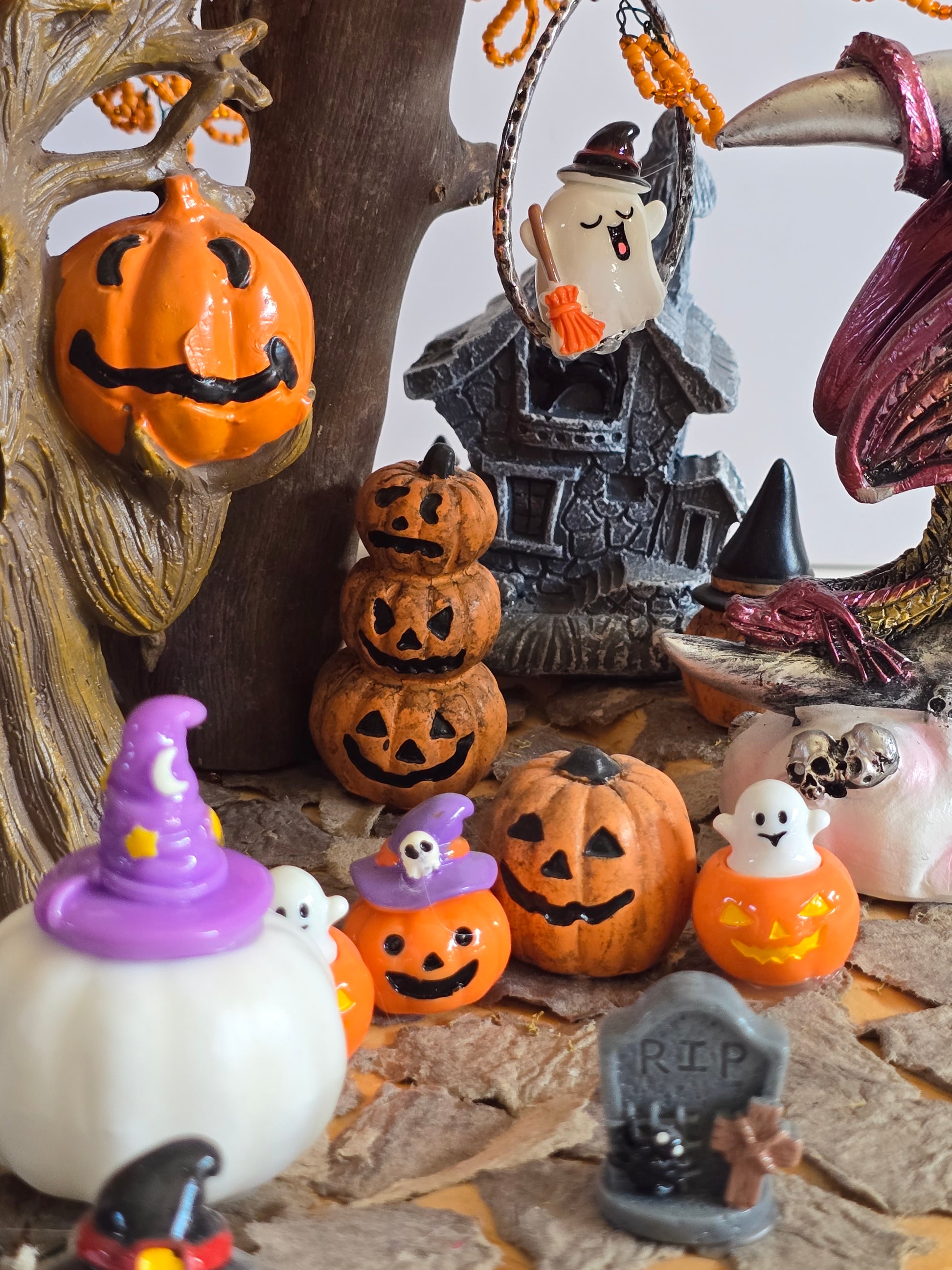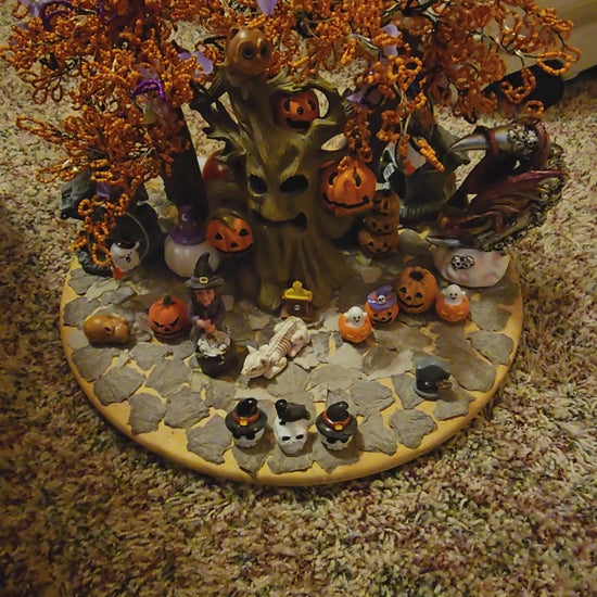 The Halloween Fun Spooky Decoration is a 15 inch round by 12 inches tall figurine made if glads, plastic, and beads, perfect for adding a spooky touch to your home during the Halloween season. It features lights in the tree, creating a fun and festive ambiance. The tree is made with beads and wire. All handmade. With a free-standing design, this decoration can be placed in any room to enhance your seasonal theme. Easy to care for and made in USA, this Halloween decoration is sure to bring a touch of seasonal charm.