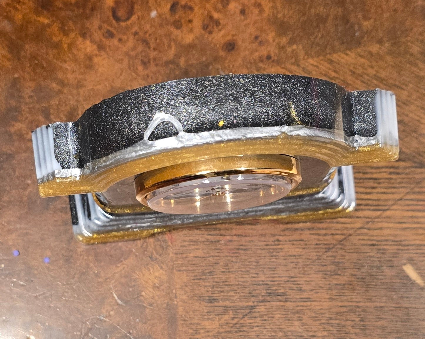 This hand-made resin clock is a unique and one-of-a-kind piece that measures 5 by 6 inches. Featuring a quartz movement, this round analog clock is powered by batteries and is designed for standing use in a living room, bedroom, or home office. Made with high-quality resin material, this clock is a stylish and functional addition to any space in the 21st century. The handmade brand ensures a special and personalized touch to this original piece.