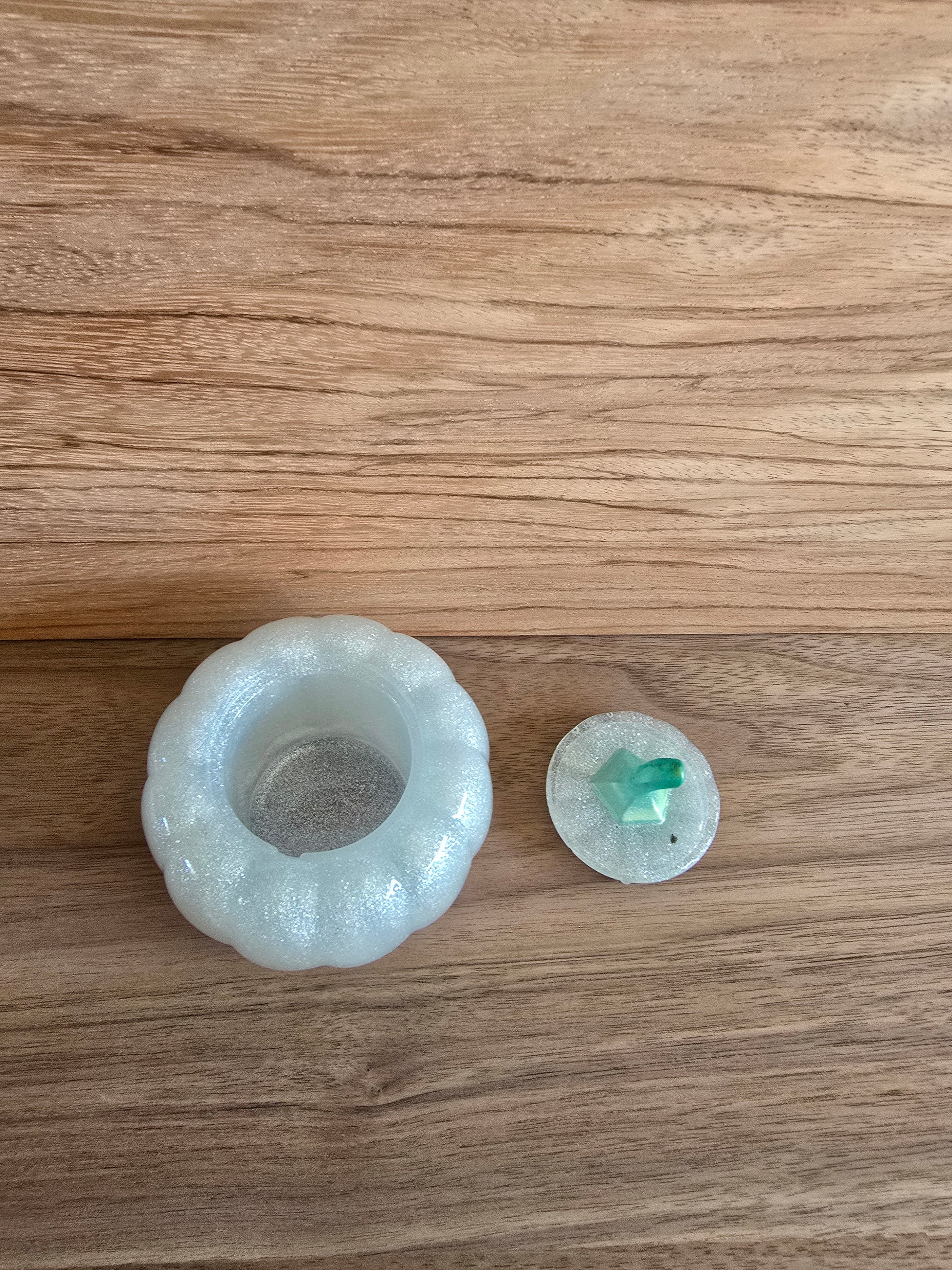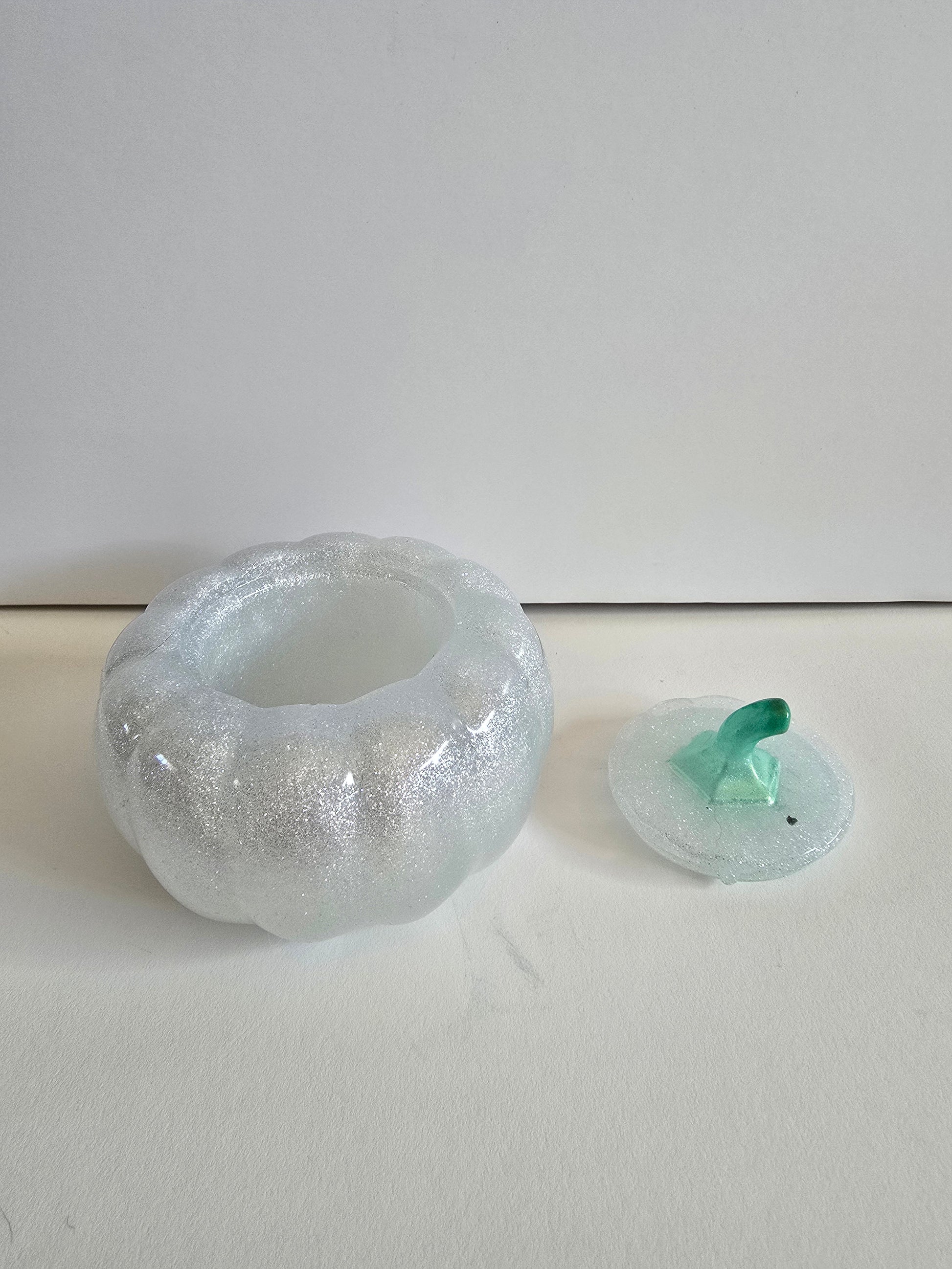 The Snow White Sparklin Pumpkin with Green Top is a charming handmade figurine made of resin, standing at 3 1/2 inches wide by 3 inches tall. It features a white color with a green top, adding a touch of whimsy to any holiday or seasonal decor. The pumpkin subject adds a festive and autumnal feel to this unique collectible.